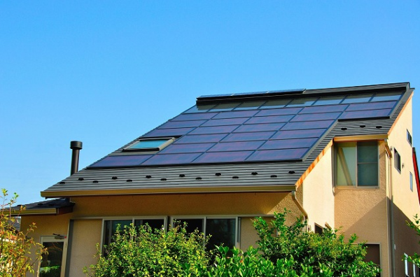 個人宅の場合、屋根の上にソーラーパネルを設置し、太陽エネルギーを電気に変換。