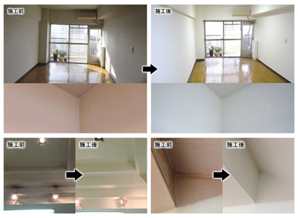 塗料に含まれる、光触媒酸化チタンの働きにより、室内の嫌な臭いの元を分解、消臭します。また、臭い発生のメカニズムで ある、「細菌の大量繁殖」を抑制する銀イオンも含まれており、光が当たらない場所でも消臭効果があります。