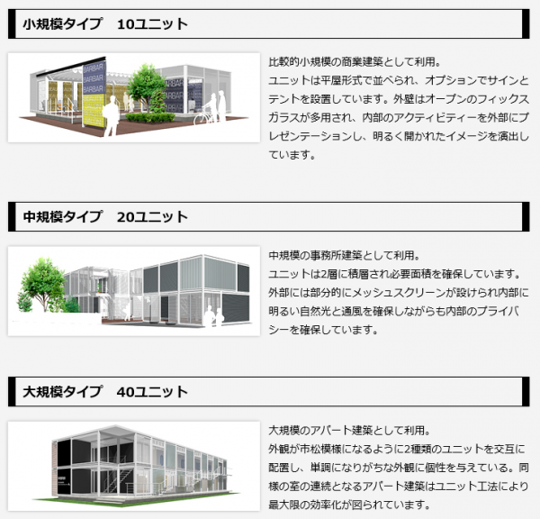 規模、予算、用途に合わせてワンユニットからの製作はもちろん、複数のユニットを使って、“積み木を組み立てるように”自由に組み合わせることが出来ます。
