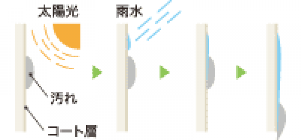 光触媒(太陽光)により超撥水性が生み出され壁が水をはじかない超親水性状態になるので雨水が汚れを浮かせて汚れを洗い流します。