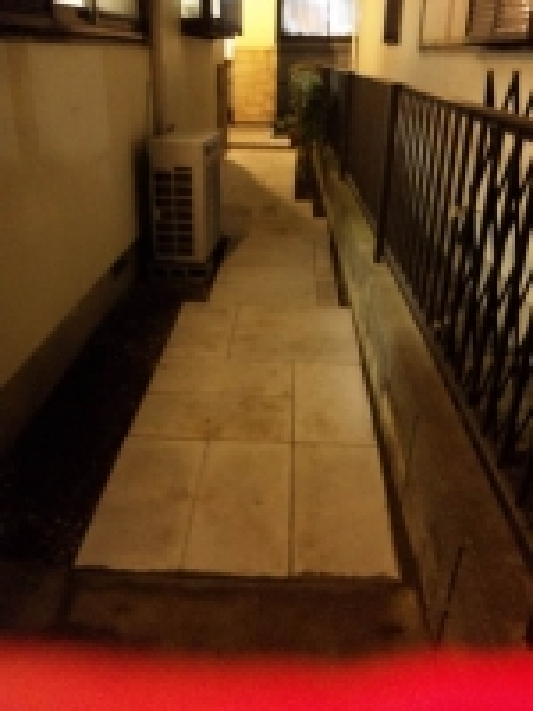 飛び石と砂利の玄関アプローチに、コンクリート平板を敷き詰め車椅子が通行し易くなるように施工しました。